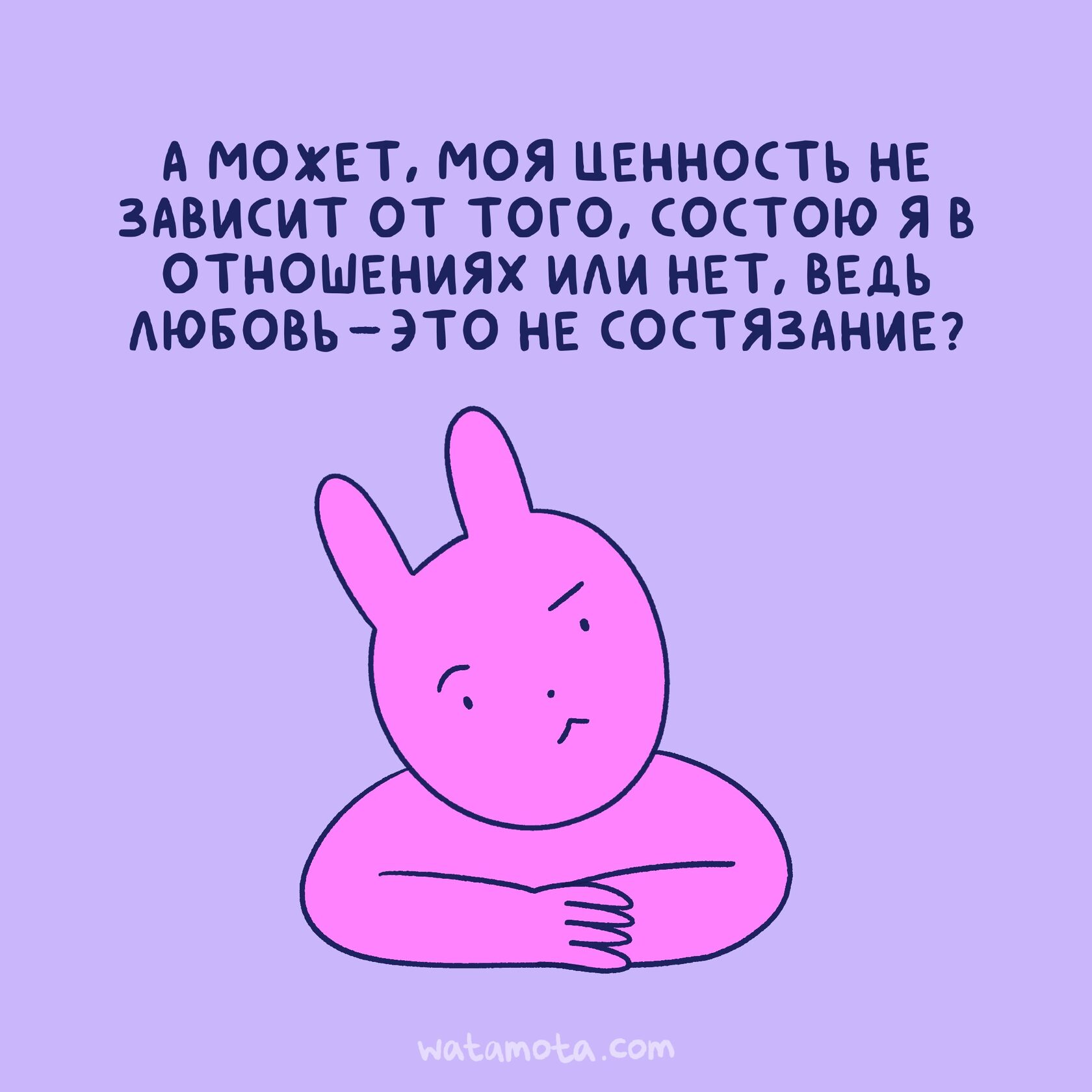 Как будто отношения — это экзамен, а вы его не сдали. Но любовь не приходит «по расписанию», не гарантируется возрастом, стараниями, «проработанностью». Отношения могут начаться в любой момент жизни – ведь это не соревнование.