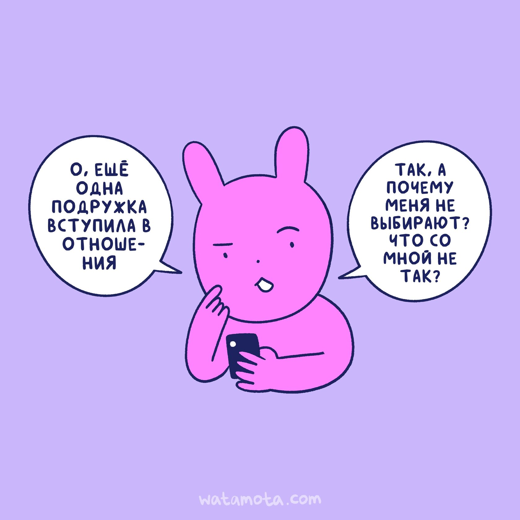 Вопрос не только в том, что вы одиноки,. а в том, что чувствуете, будто так не должно быть (ведь пара обязательно нужна!). Вы начинаете нападать на себя, сравнивать с другими, искать подтверждение, что всех вокруг выбрали, а вас нет.
