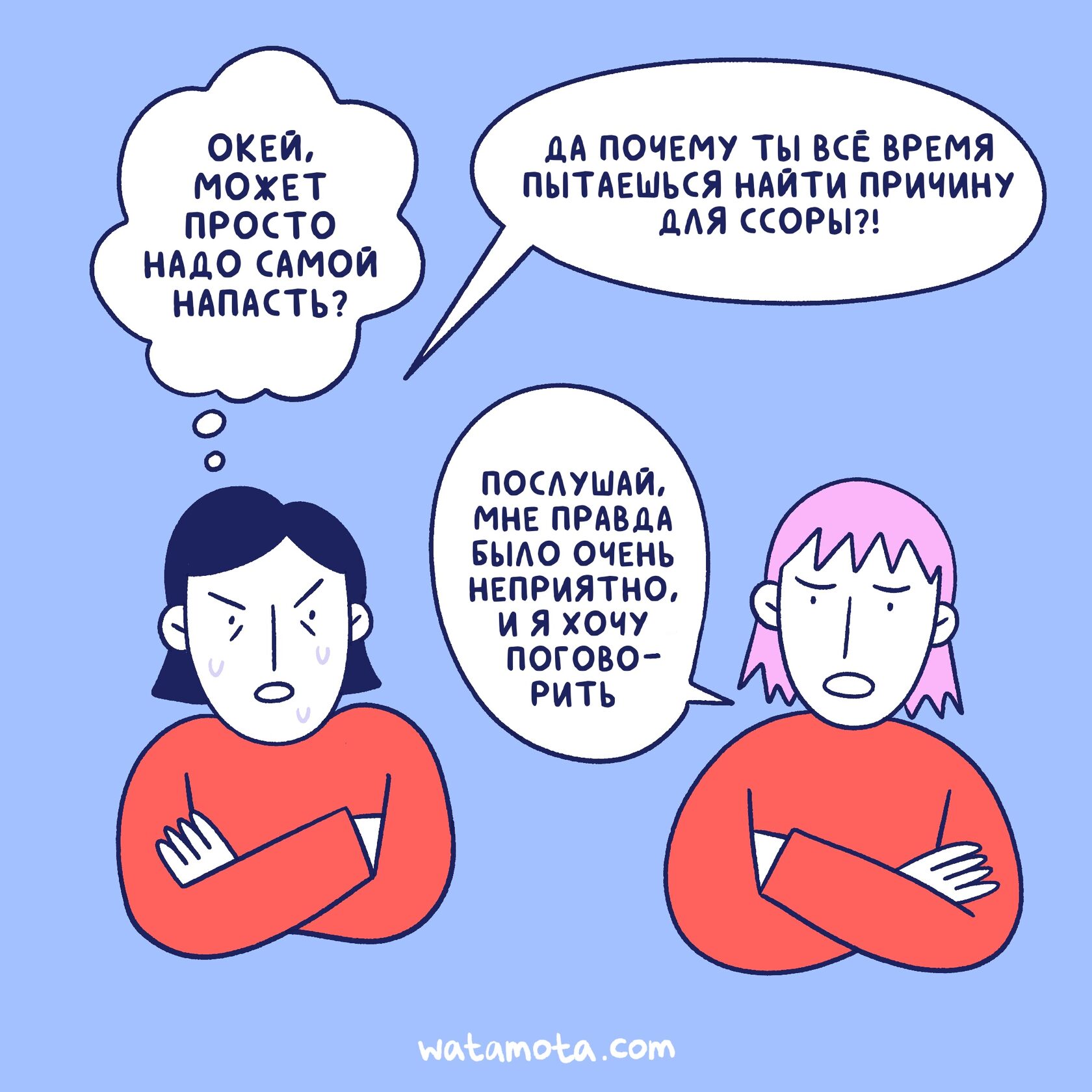 🟣Атаковать: защититься обвинением в ответ («Опять у тебя лицо недовольное!»)