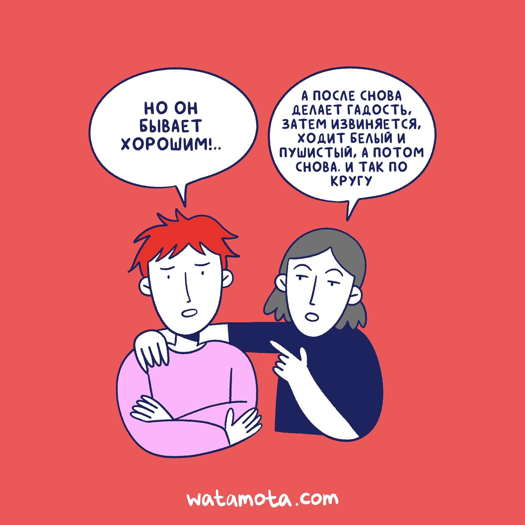 Абьюзивные отношения — это связь, в которой один партнёр систематически причиняет вред другому: эмоционально, физически, психологически.