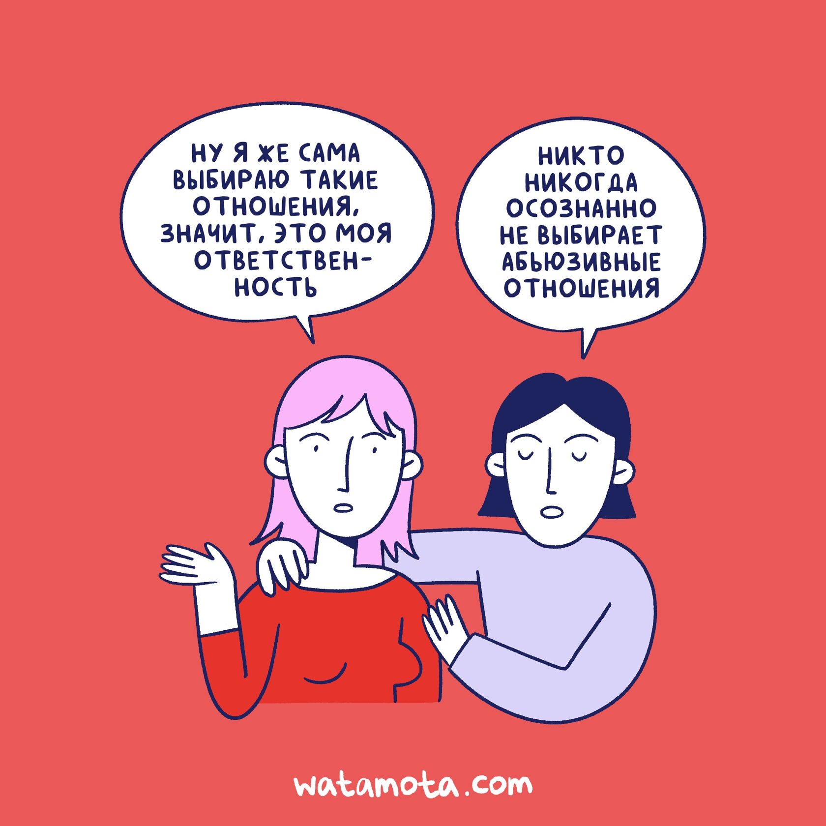 Когда речь заходит об абьюзивных отношениях, от окружающих можно услышать: «Ну, ей, наверное, так удобно», «Некоторым просто не подходят здоровые отношения».