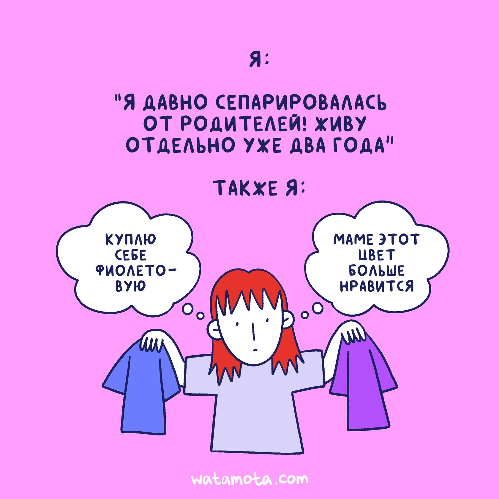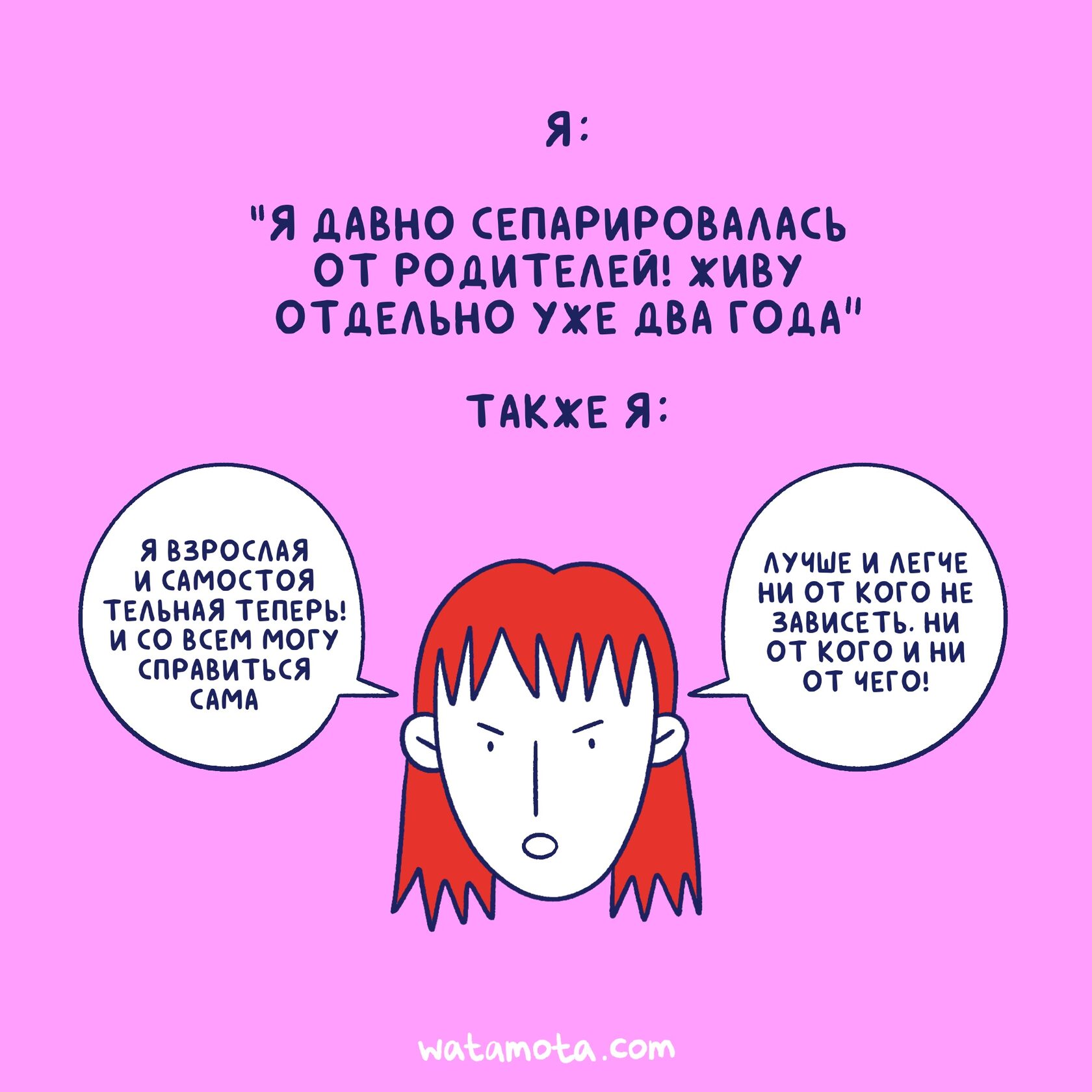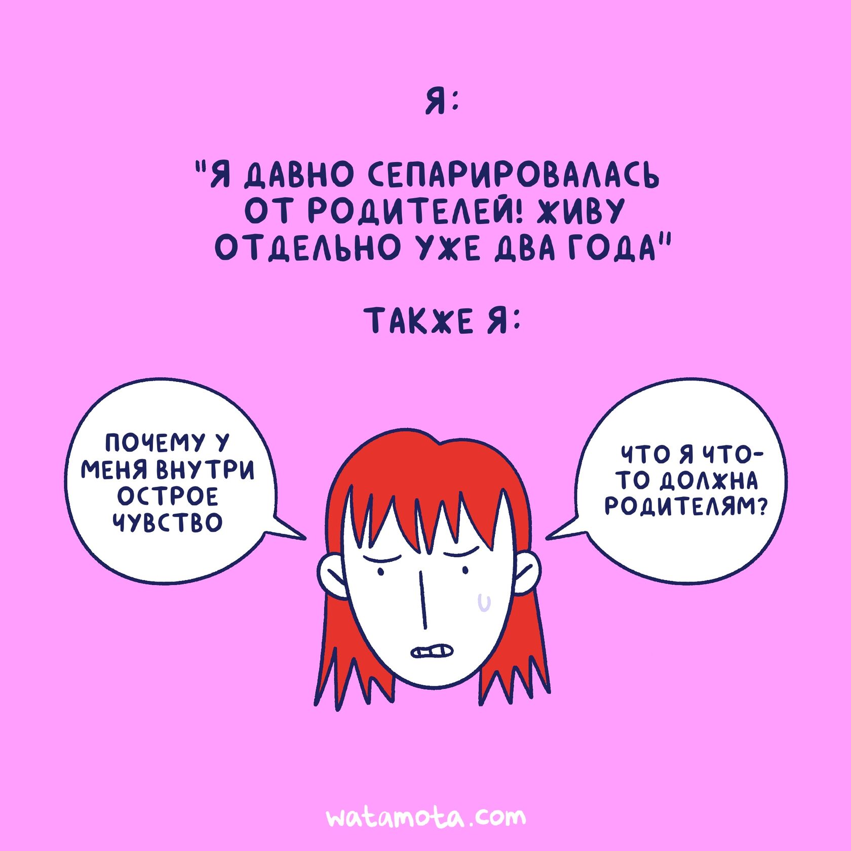 Но важно понимать, что сепарация зачастую требует психотерапии: как минимум потому, что отношения с родителями могут быть болезненными.