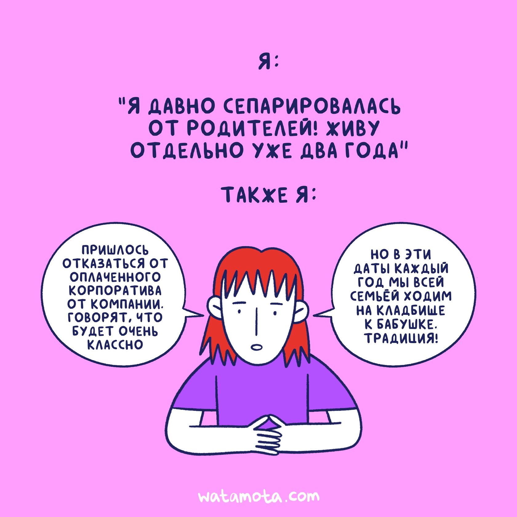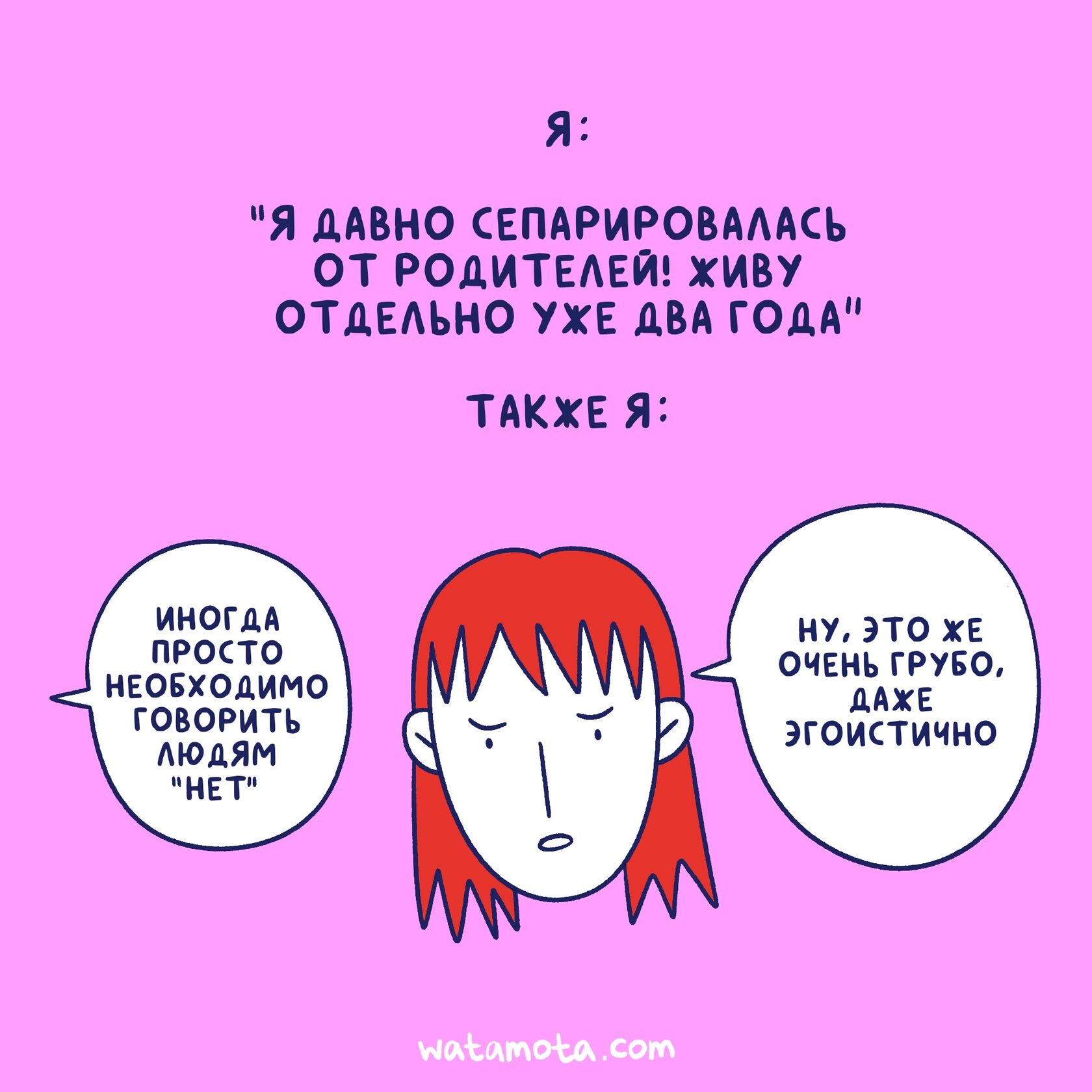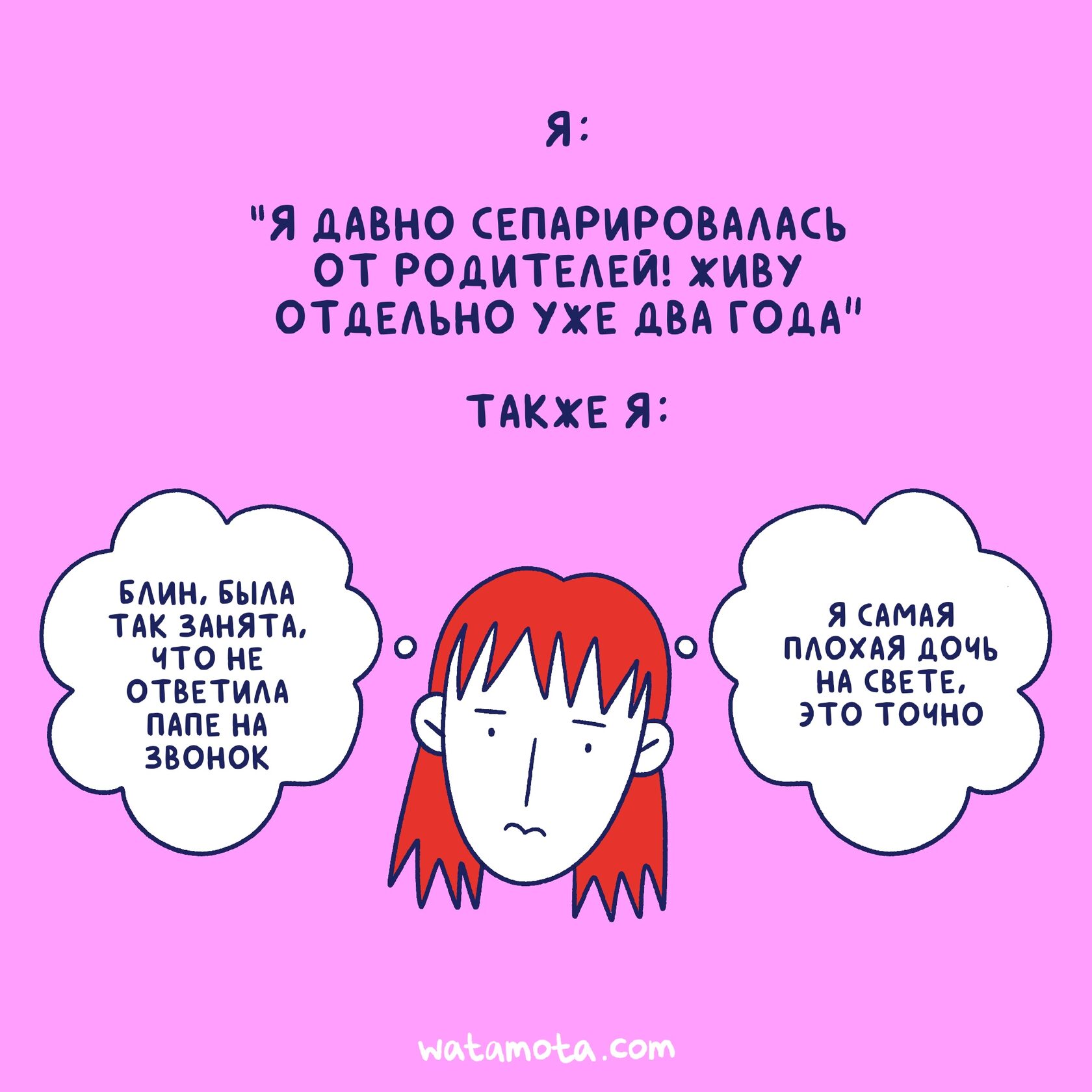 Но важно понимать, что сепарация зачастую требует психотерапии: как минимум потому, что отношения с родителями могут быть болезненными.