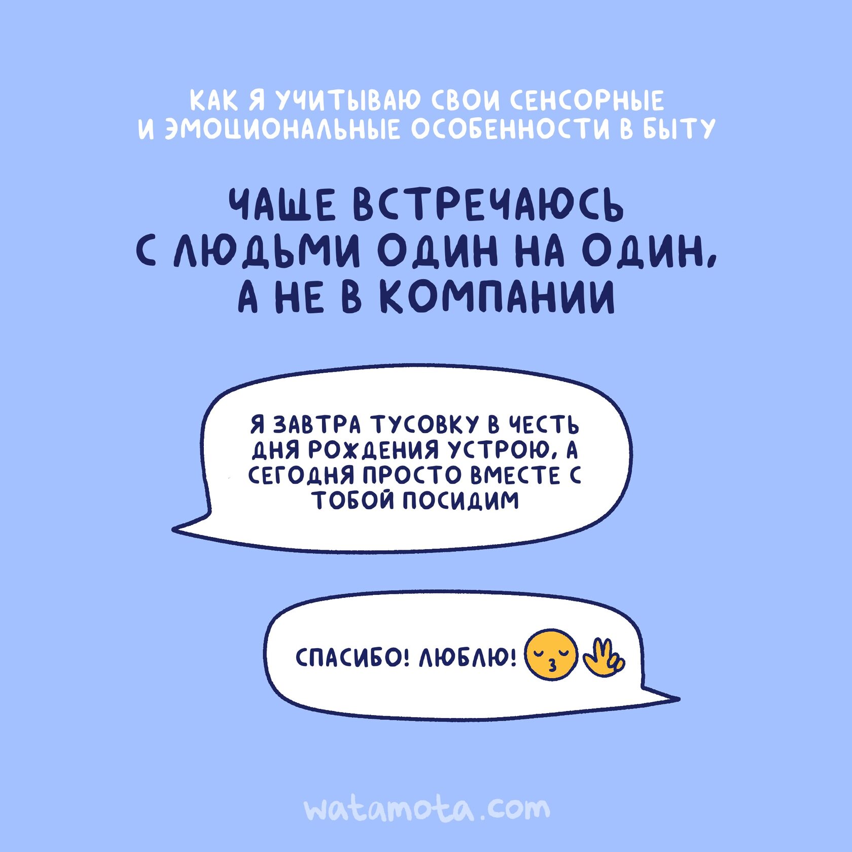 Вы не обязаны быть «как все»: любить вечеринки, много гостей, обниматься по команде, терпеть неудобные вещи. Вы можете выбирать то, что будет комфортнее для вас.