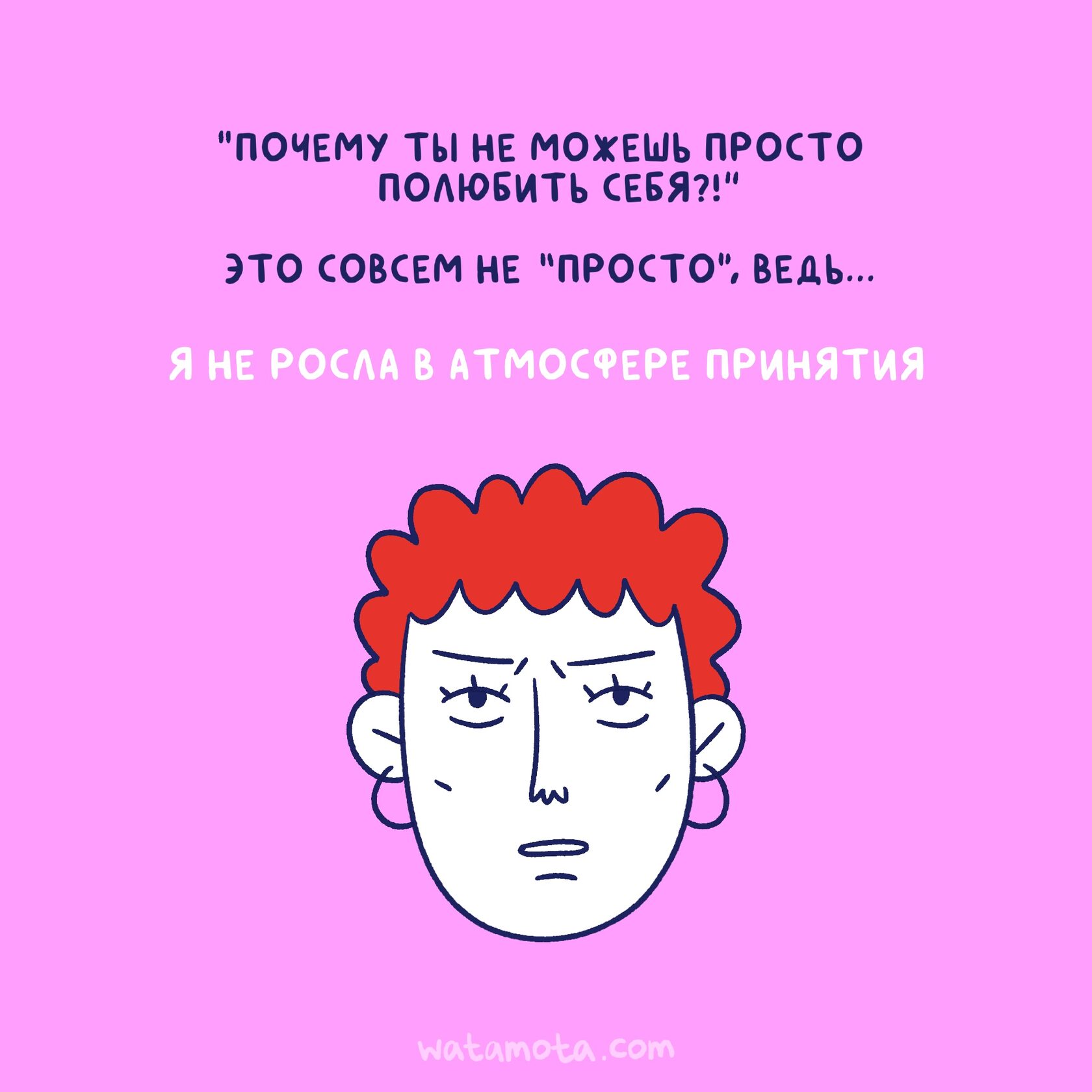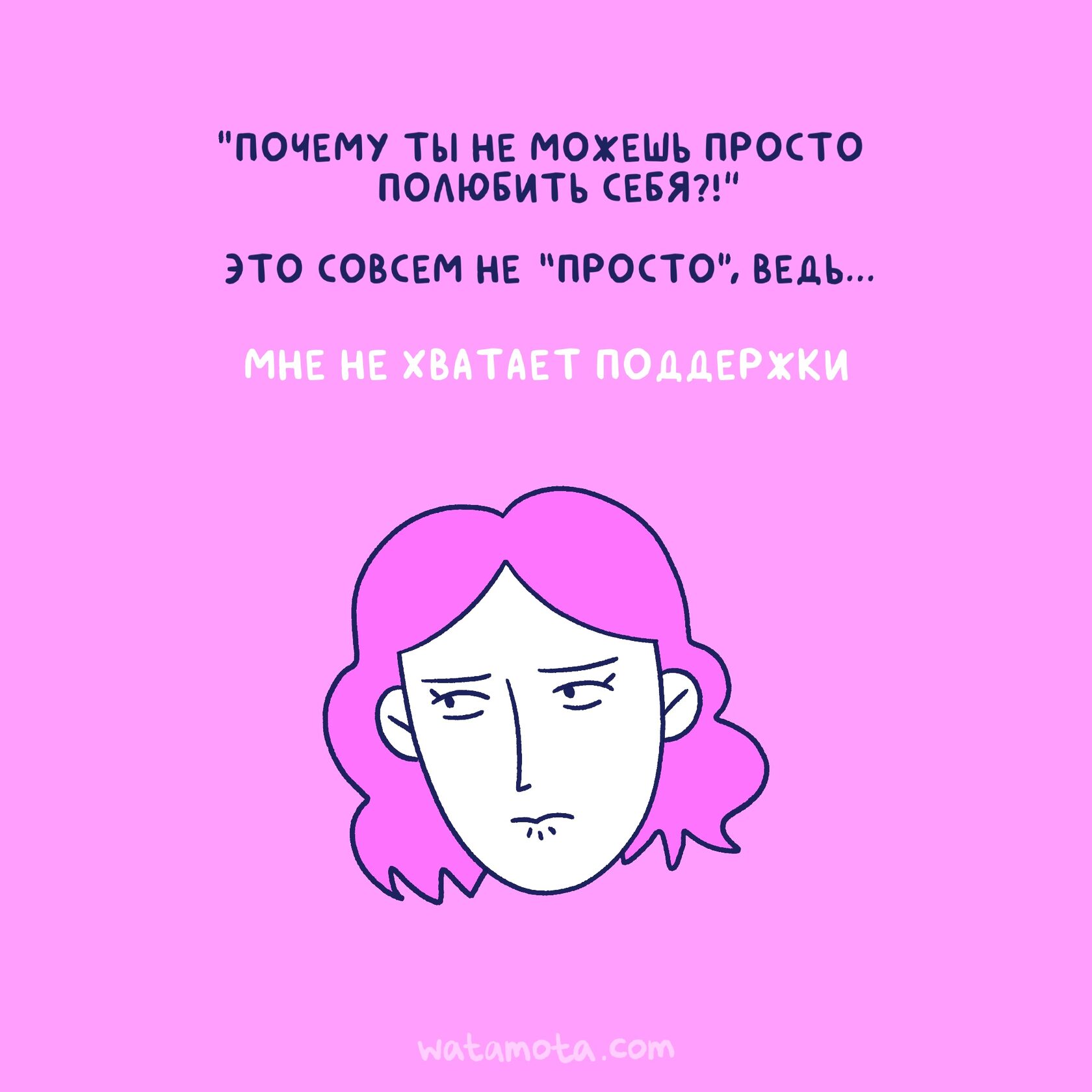 А ещё — из среды, где тебя не обесценивают, не сравнивают, не истязают «добрыми» советами, как правильно любить себя.