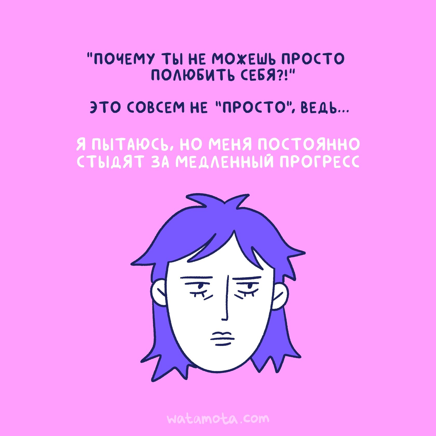 Так не должно быть. Каждый идёт в своём темпе, из своих условий и с учётом своей истории. Заставлять человека любить себя и стыдить, если не любит — не про поддержку, а про новую форму давления.
